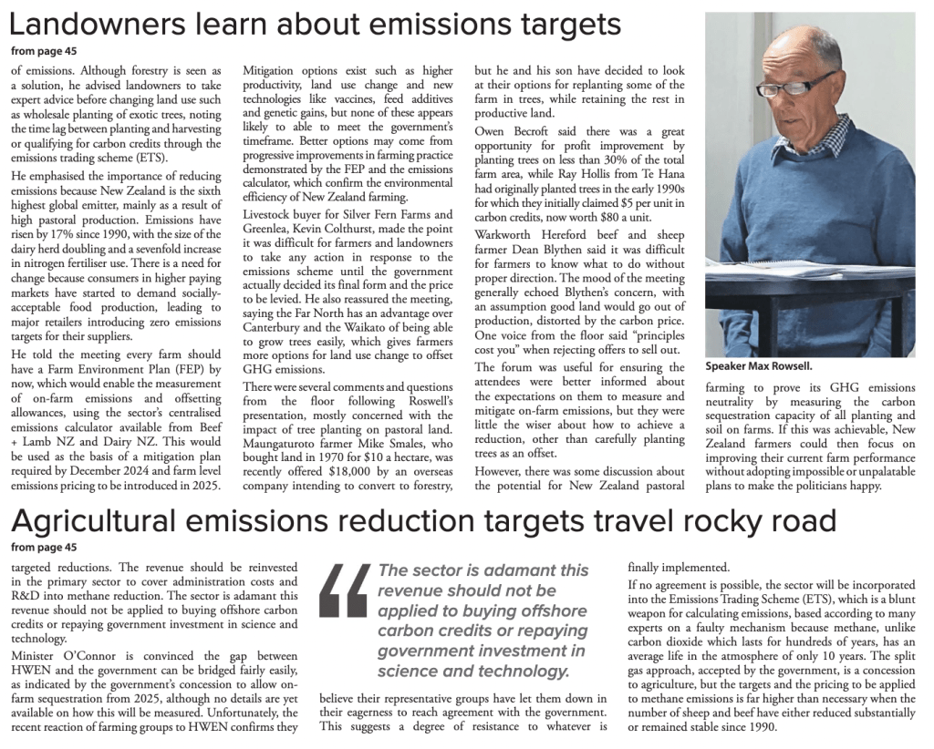 The LCA’s recent information forum on the Government’s proposed Greenhouse Gas (GHG) emissions pricing scheme was attended by a group of around 30 landowners, farmers and professionals. Held at the Wellsford RSA and led by main speaker Max Rowsell, the forum was organised by the LCA to help farmers understand their options and obligations when the scheme comes into law. Below is an article that appeared in the Mahurangi Matters.